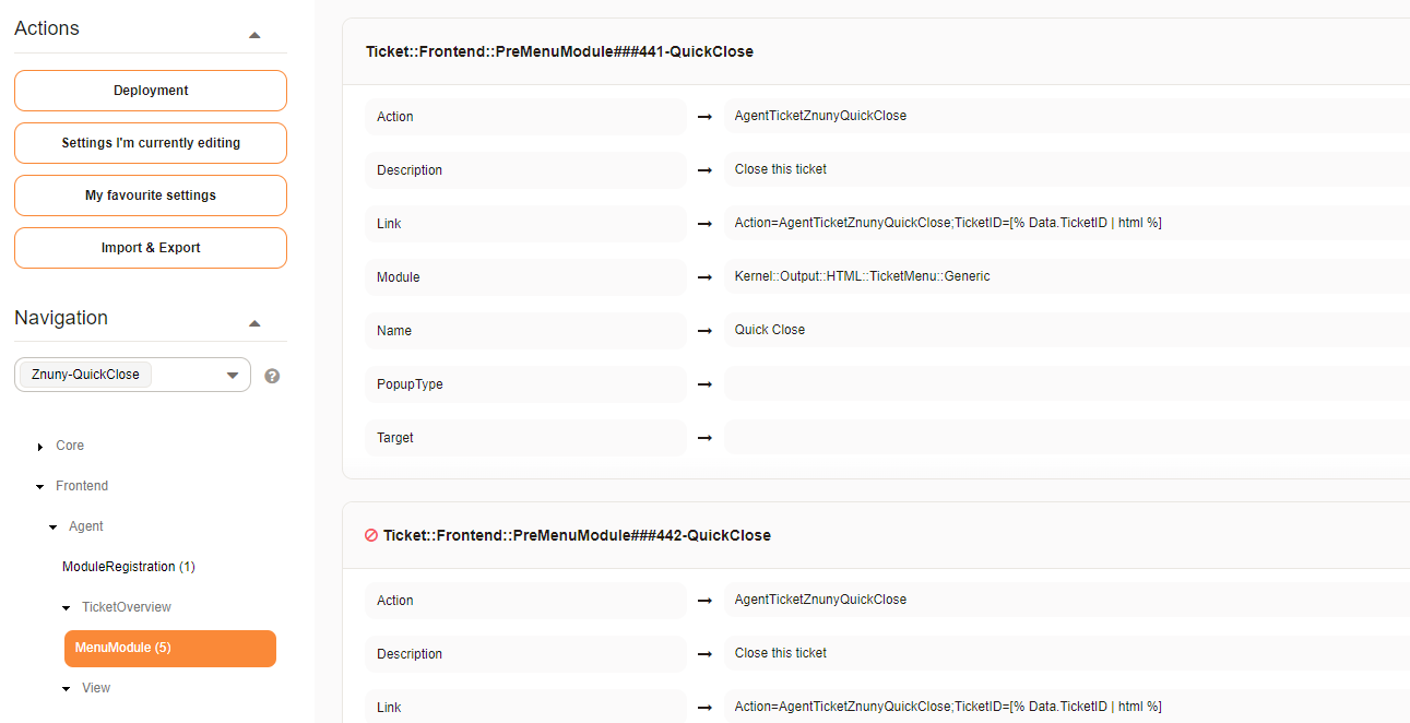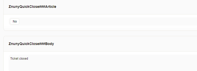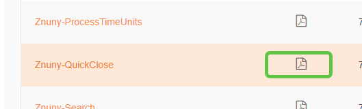 Configuration, as with all add-ons, is simple, auditable, and available in the ( link: https://doc.znuny.org/znuny_lts/admin/systemconfiguration/index.html#system-configuration text: system configuration) front-end. Navigate to and select the group Znuny-QuickClose to activate the menu and pre-menu modules you desire.