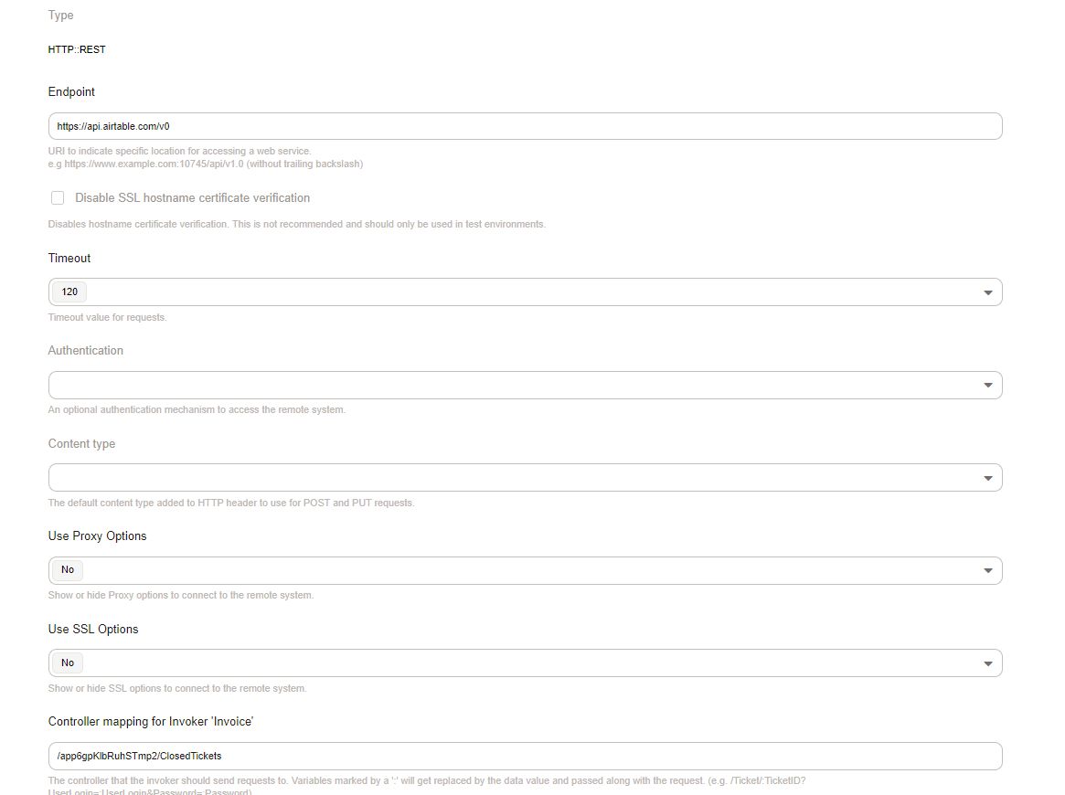 In this example, we would like to access the Airtable API, to record the customer, the time spent within the ticket, and the billing code for the request. The customer and time spent will be used from the accounted time feature and customer data within the ticket. The billing code will be read from the queue preference, by the generic interface module.