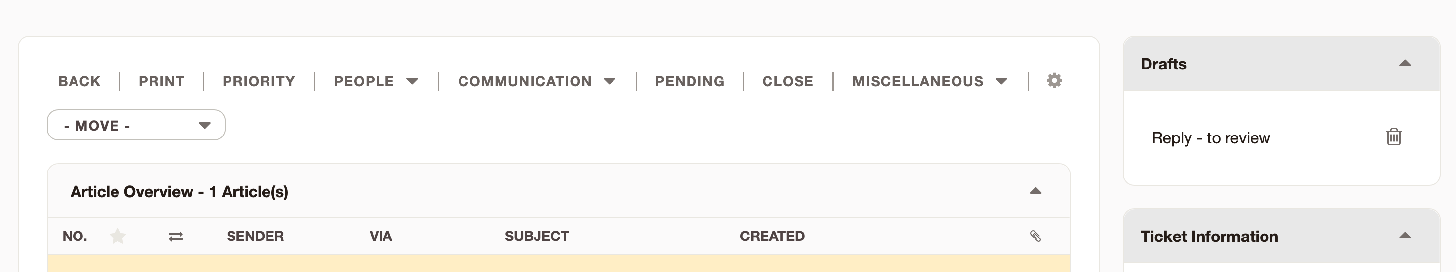 Znuny offers the draft feature to ensure that you can save your work at any time and in different variants to ensure that when you're ready to communicate, you can do this in the best possible way. Each time you open a communication window, whether a reply or a new E-Mail, you can save a draft.