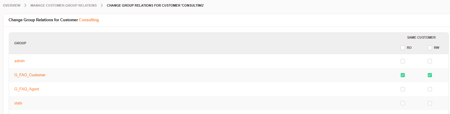 Important: Once the customer group feature is active, it also applies to queues. Be sure to assign your customers to all groups for queues where they need to see tickets in the customer portal.
