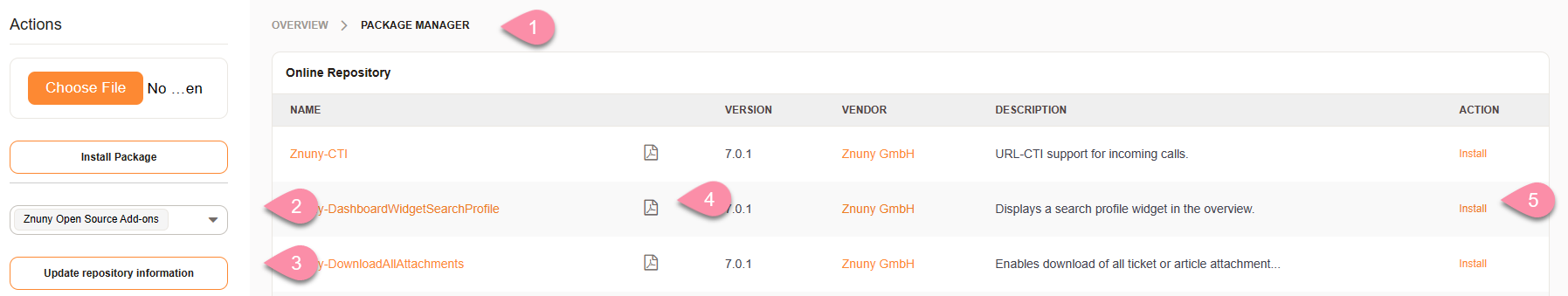 Scroll through the list of add-ons and find 'Znuny-DashboardWidgetSearchProfile.' Click on it to install from the online Repository, or read the documentation before installing by selecting the PDF Icon. Follow the prompts to complete the installation process.